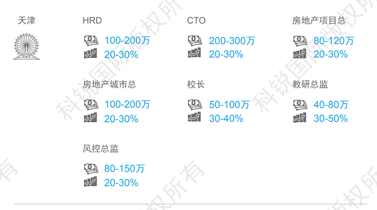 天津整体薪资呈现上涨的趋势,尤其金融、教育、高科技等行业,核心岗位如在线教育的教学教研岗、AI算法、底层开发架构等岗位跳槽涨幅可达30-50%。本数据来源于猎头公司U钱包国际(中国)国际资深行业专家对2021年热门职位薪酬范围及跳槽涨幅的预测,供HR和猎头招聘参考。